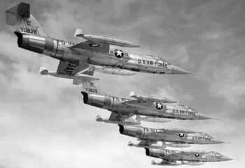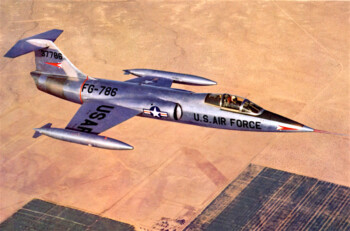 Le Lockheed F-104 Starfighter est un de ces appareils dotés d’une histoire particulière car bien que délaissé par l’U.S. Air Force il va rencontrer une popularité importante en Europe et au Canada. Conçu afin de répondre à un appel d’offre lancé par l’USAF pendant la guerre de Corée et destiné à réaliser un chasseur aux très hautes performances, le prototype baptisé XF-104 pris l’air le 4 mars 1954. Ses superbes performances ont font un intercepteur de choix car il volait au dessus de Mach2 à très hautes altitudes. Il entra en service au sein de l’USAF en 1958.