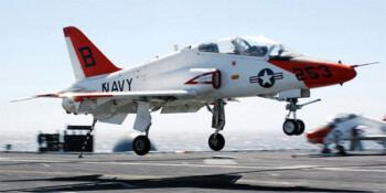 Le développement du T-45 révéla rapidement la complexité technique de l’adaptation d’un avion terrestre aux contraintes de l’aviation embarquée. Le prototype effectua son vol inaugural le 16 avril 1988, mais les premiers essais d’appontage ne débutèrent qu’en décembre 1991 après d’importantes modifications structurelles et aérodynamiques. Ces retards, bien que frustrants, permirent l’optimisation complète des caractéristiques d’appontage, aboutissant à un appareil remarquablement adapté aux opérations embarquées malgré ses origines terrestres.
