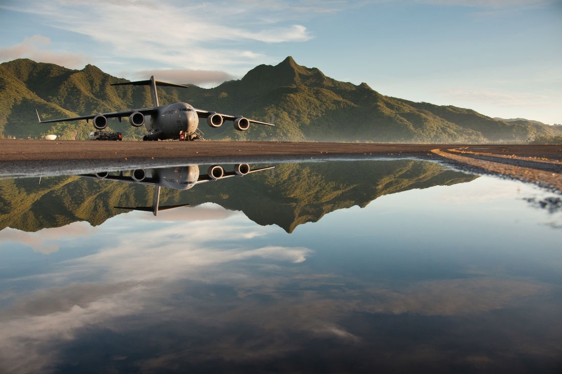 Cette semaine, hormis un titre digne d’un Me Capello anglophone (je vous laisse chercher), une superbe image d’un Globemaster III parqué et bien seul devant les montagnes d’une île isolée du Pacifique et son reflet au premier plan. Un stationnement étonnant qui a quelque chose de très pittoresque. Si l’on se réfère au le site de l’US Air Force, ce Boeing C-17 a été photographié sur la piste à l’aéroport International de Pago Pago aux Samoa américaines (NDLR : je ne savais pas qu’il y a avait un territoire américain aux îles Samoa). Il est même précisé que la flaque d’eau au premier plan a été formé après le passage du cyclone tropical Evan.