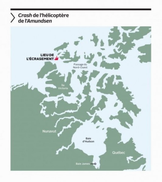 L’appareil M.B.B. BÖ-105, était muni d’une balise qui émettait un signal permettant à l’équipage du brise-glace de connaître la position de l’appareil en vol. Quand le navire a cessé de recevoir le signal, l’Amundsen s’est dirigé vers la dernière position connue de l’hélicoptère. C’est dans ce secteur que les dépouilles des trois hommes flottant sur l’eau ont été localisées. Le pilote de l’appareil Daniel Dubé, le commandant de l’Amundsen Marc Thibault et le scientifique Klaus Hochheim de l’Université du Manitoba ont survécu à l’écrasement mais sont décédés d’hypothermie en raison de leur trop long séjour dans l’eau glaciale.