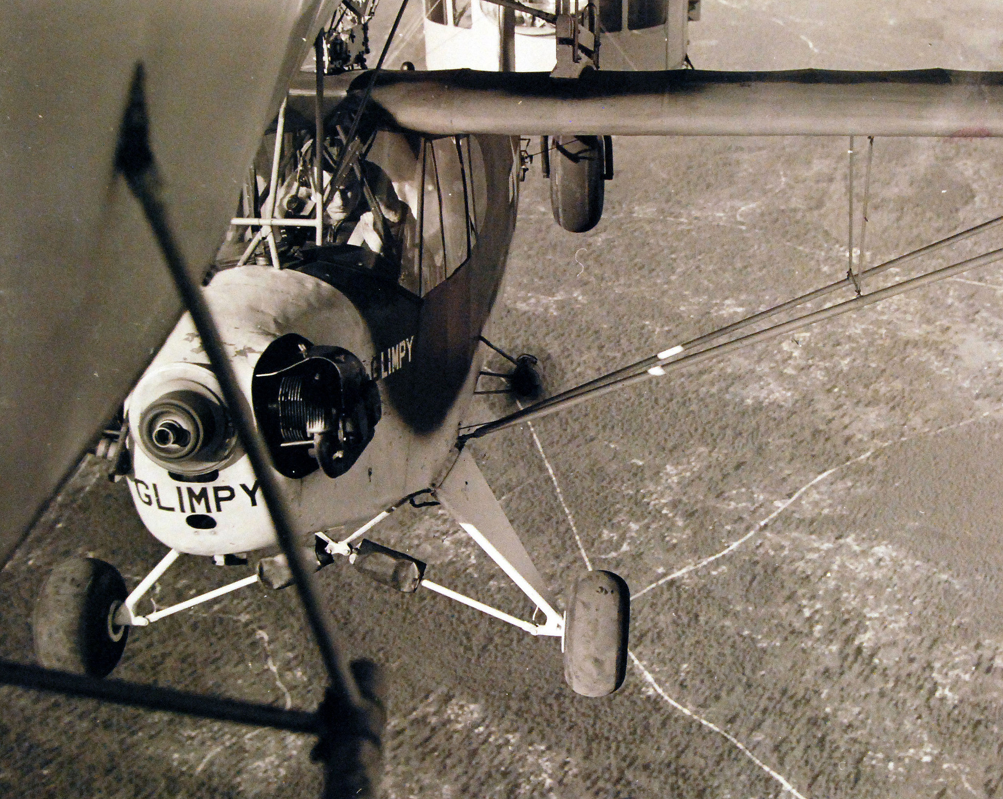 Voilà bien un des épisodes aéronautiques les plus méconnus de la Seconde Guerre mondiale. Au printemps 1944, la marine américaine décida de tester le Piper Cub en tant qu’avion de reconnaissance à partir d’un dirigeable de lutte anti-sous-marine, sans que cela ne débouche sur quoi que ce soit. L’idée d’un avion-parasite n’avait rien de nouvelle pour les amiraux américains, ayant déjà utilisés (brièvement) durant l’entre-deux-guerres les fameux chasseurs monomoteurs Curtiss F9C Sparrowhawk.