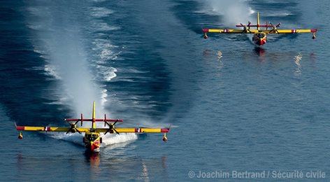 Les deux Bombardier CL-415 permettent de frapper au plus près l’incendie avec de l’eau (voire très rarement du liquide retardant). Une technique d’attaque du feu que les pilotes français maîtrisent particulièrement bien et qui explique entre autre pourquoi ils sont si souvent demandés par les pays étrangers.