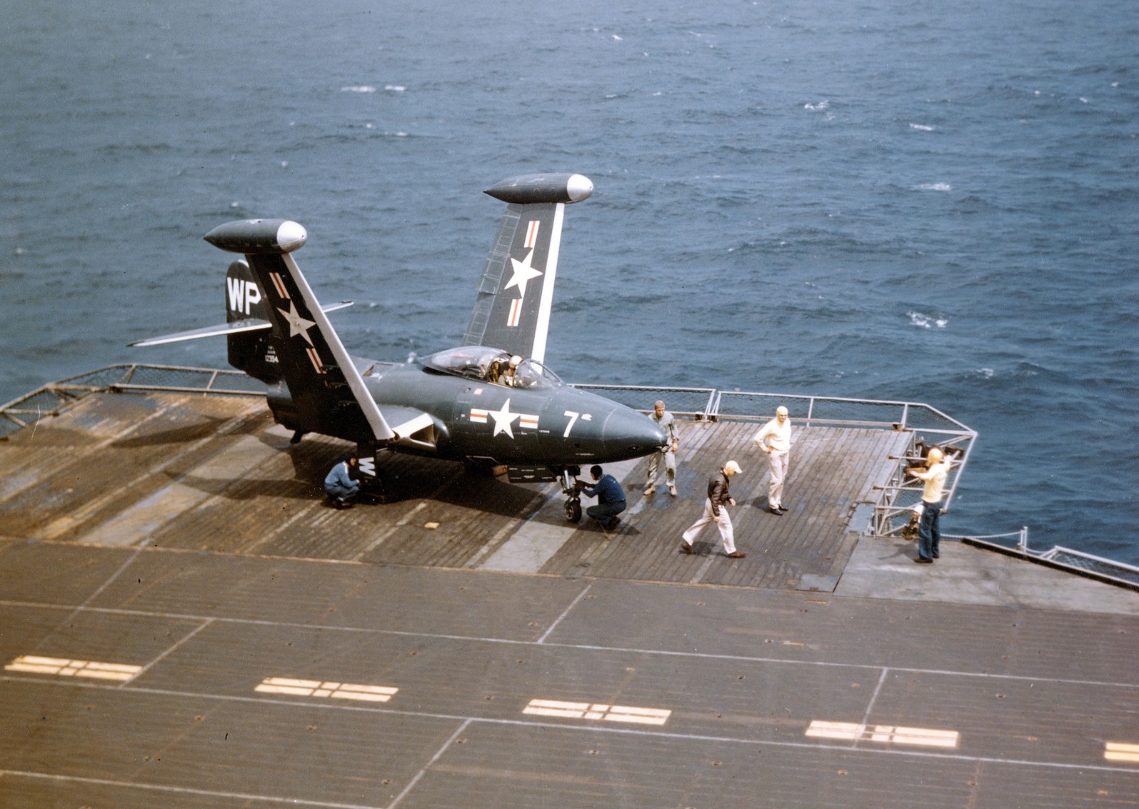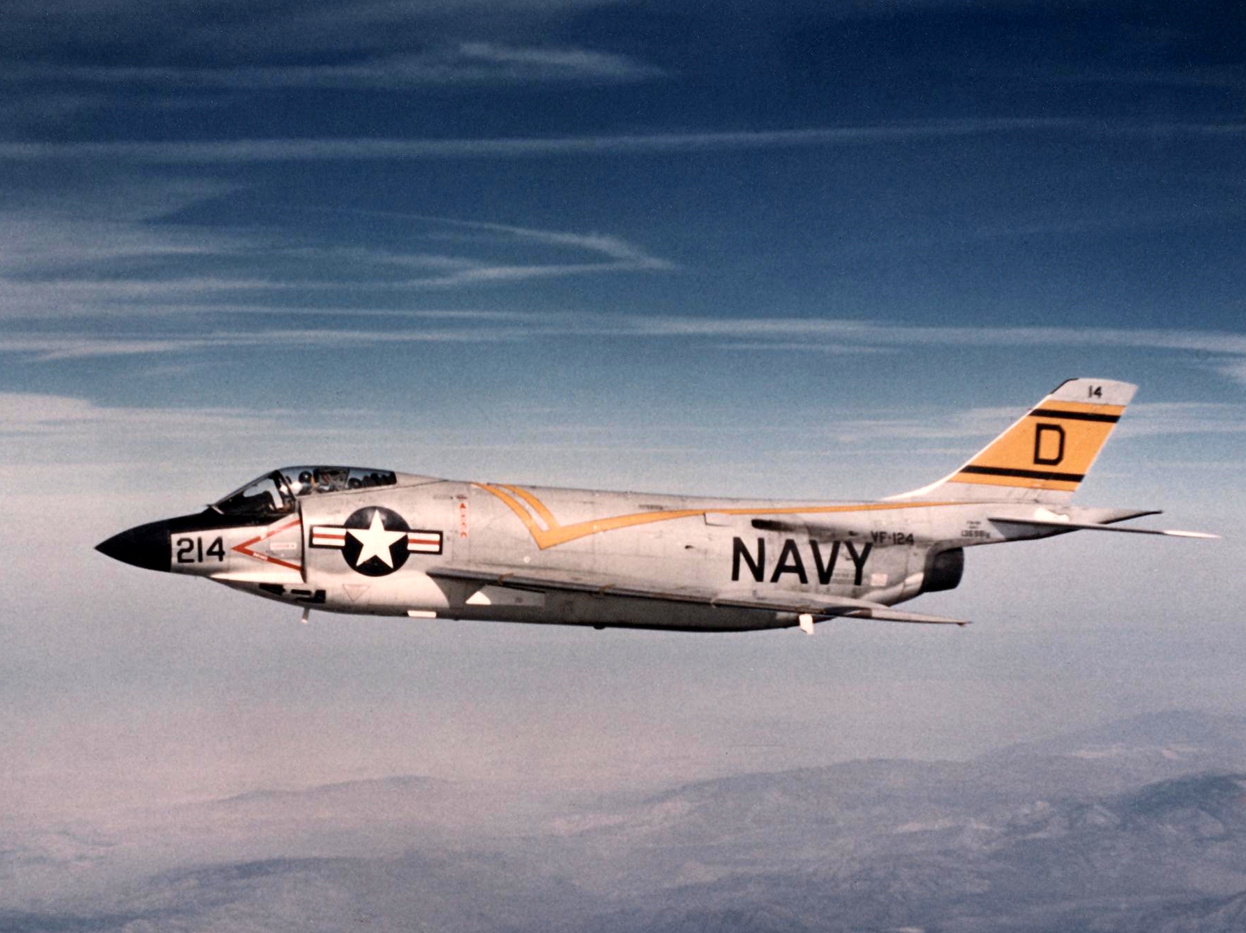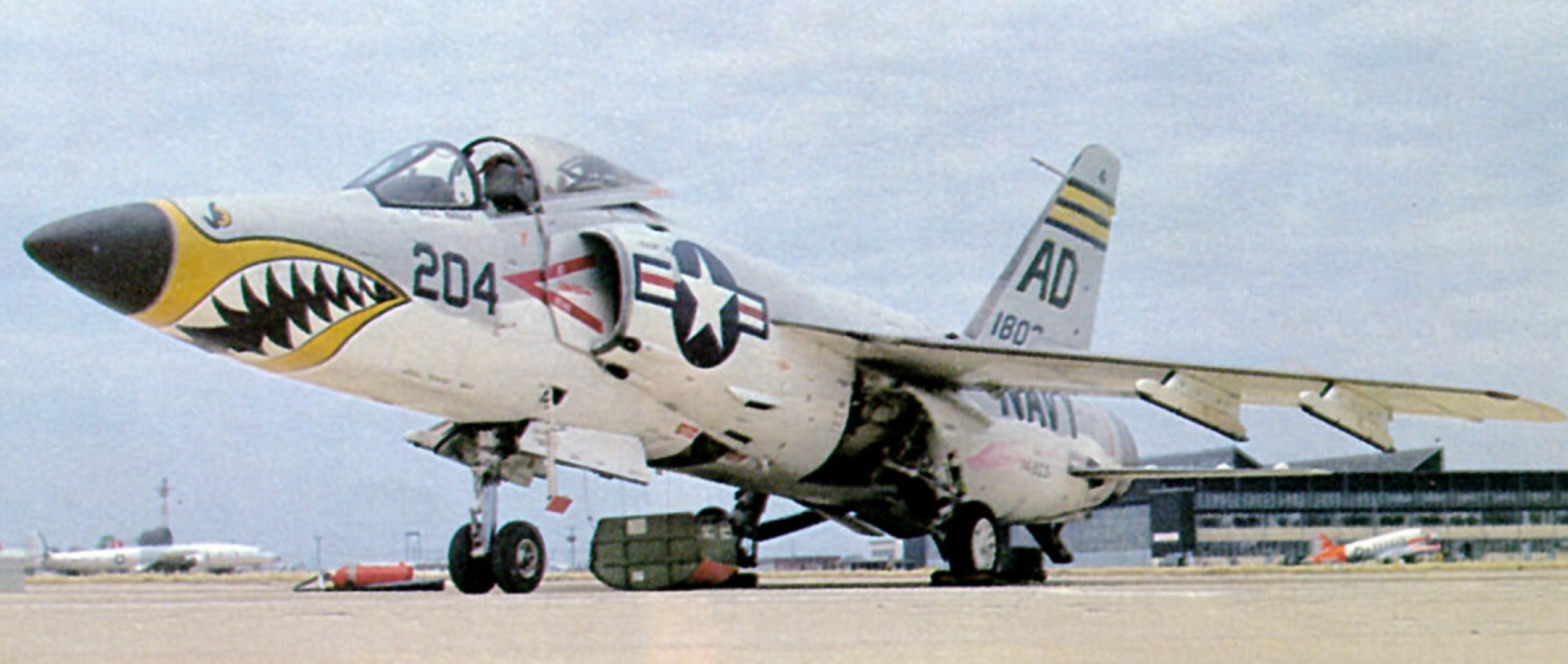 En ce qui concerne l’USAF, à l’époque les nose-arts et les insignes d’unités étaient directement issus de l’héritage de la seconde guerre : métal nu (pour économies de vitesse et de peinture) + bandes / lettres distinctives hyper voyantes et colorées. A contrario la Navy était bien plus sage avec son Navy Blue et ses marquages blancs. Et puis ça s’est inversé, l’USAF est passée au camouflage trois tons + ventre gris, et la Navy au blanc + emblèmes chatoyants. Avant que tous n’optent pour des tons low-viz.