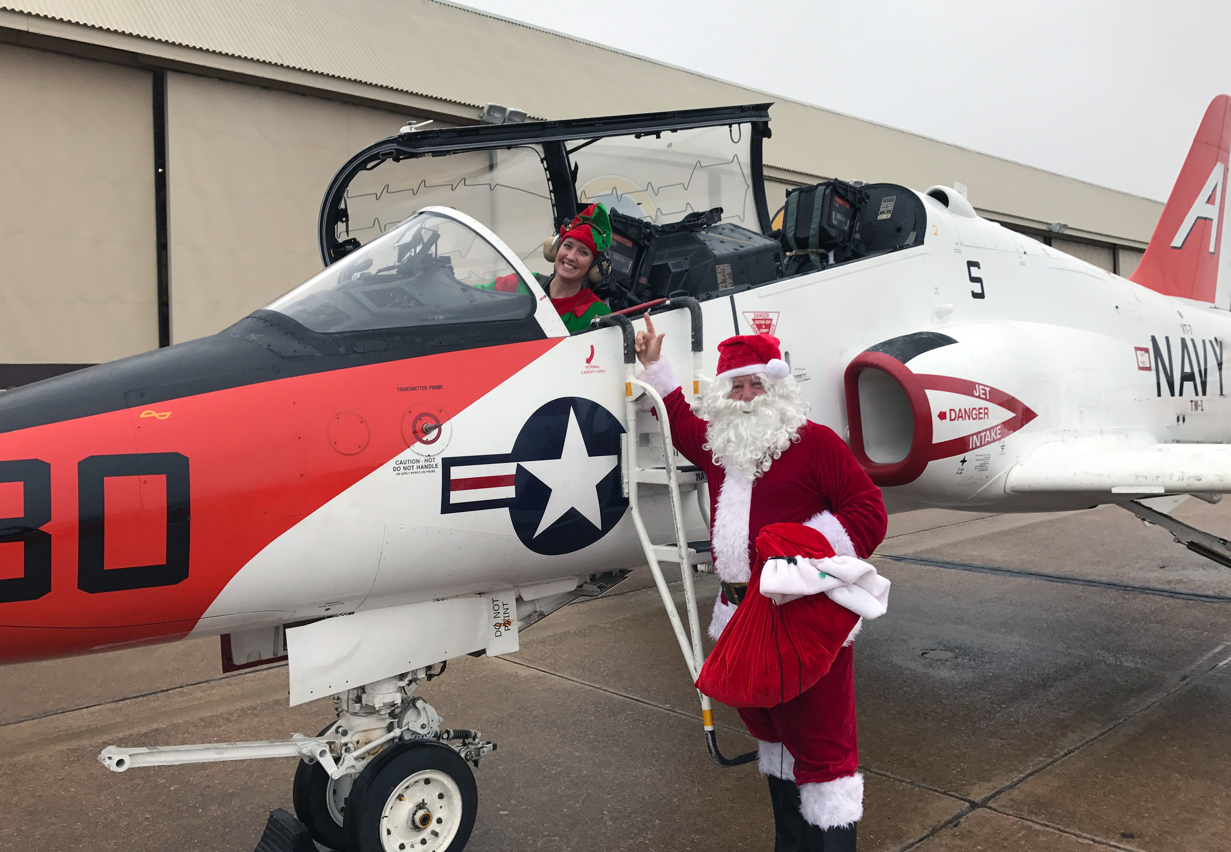 Et le Pentagone n’a pas lésiné sur les moyens alloués à celui qu’on appelle là-bas Santa Claus. Le Père Noël s’est vu affecté un monoréacteur McDonnell Douglas T-45C Goshawk, un appareil qui lui permet de se préparer au mieux aux accélérations vertigineuses de son traîneau. Il enchaîne décollage et appontage de jour comme de nuit.