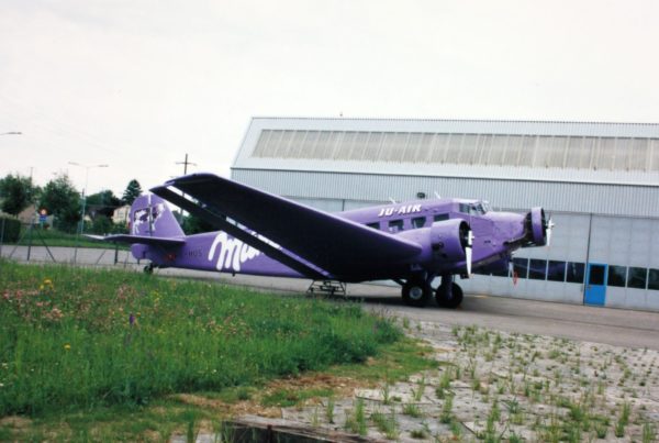 Or en 1996 un partenariat est signé entre la compagnie aérienne et le fabricant de chocolat suisse Milka afin de réaliser durant toute la saison des meetings aériens, des vols promotionnels. Et franchement les mécanos de Ju-Air n’y sont pas allés avec le dos de la cuillère. Ils ont totalement repeint le Junkers Ju 52/3 immatriculé HB-HOS avec le célèbre violet du chocolatier, sans oublier d’y apposer sa fameuse vache.