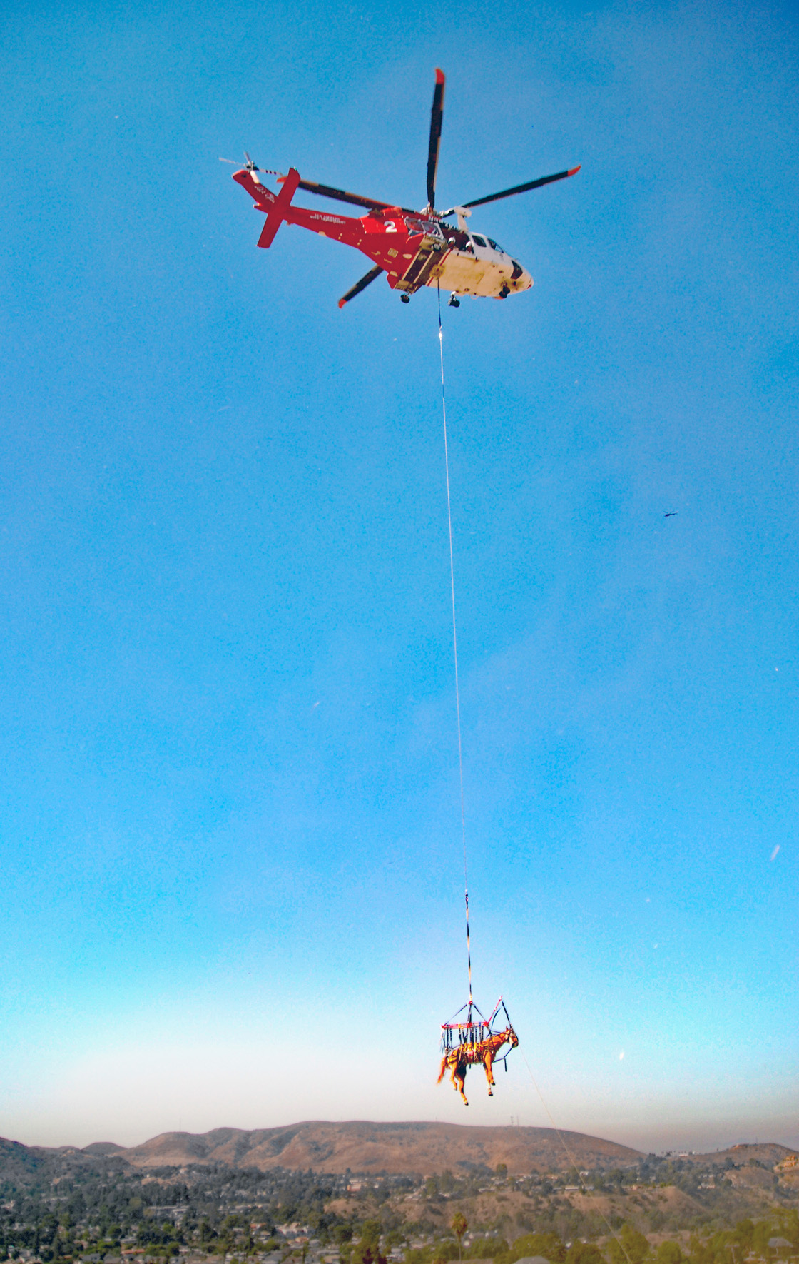 Une demande de renfort aérien est demandé afin d’hélitreuiller l’animal. L’hélicoptère Fire 2, un Agusta-Westand AW.139 porteur de l’immatriculation civile américaine N302FD, est dépêché rapidement à Sunland. C’est l’un des seuls ayant la capacité de lever le cheval. Fire 3 et Fire 5, les deux autres hélicoptères du même modèle, sont alors gréés avec leur réservoir de lutte contre l’incendie. Quant à Fire 1 et Fire 4, les deux Bell 412, et Fire 6, le Bell 206B ils ne possèdent même pas la capacité de mener à bien cette mission.