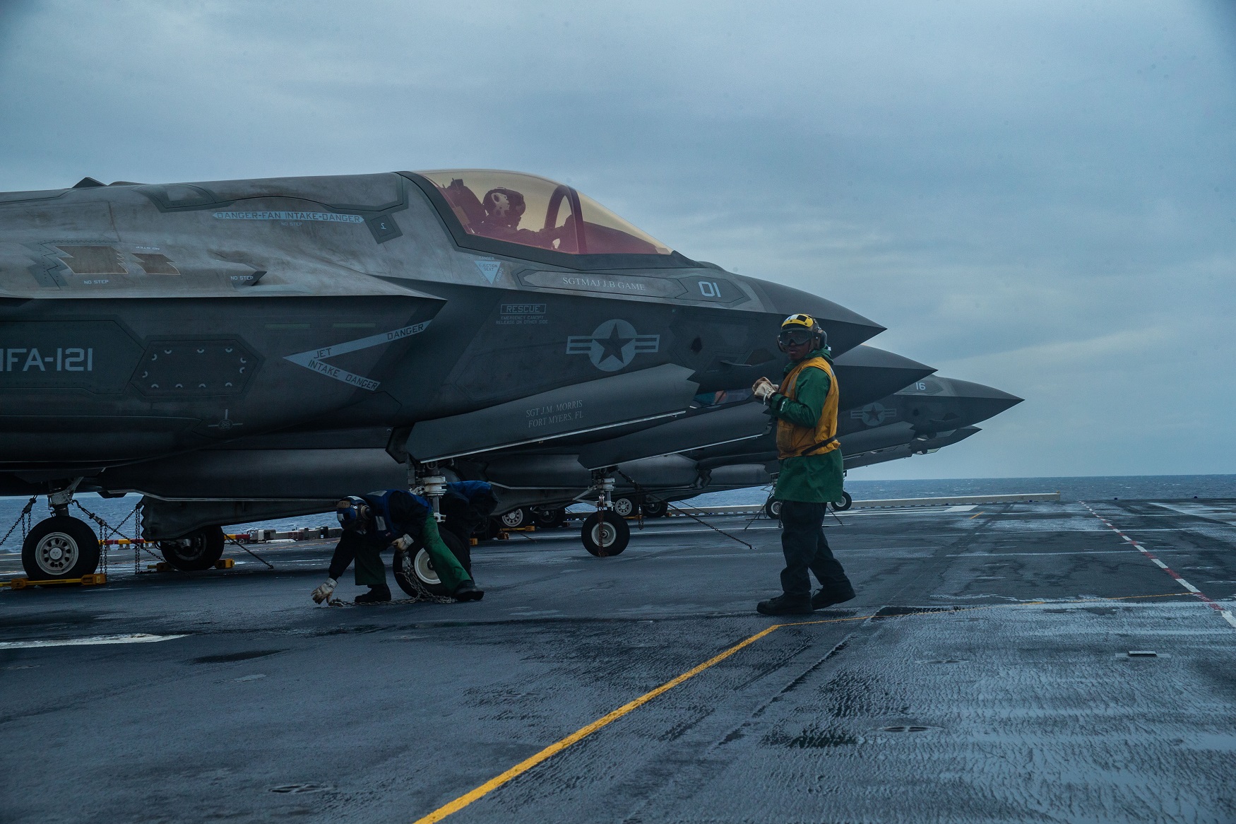 Pour tenter d’enrayer un peu la mécanique expansionniste chinoise dans la région rien de mieux que de disposer d’avions de combat. Et pour cela l’US Navy s’appuie sur les six Lockheed-Martin F-35B Lightning II appartenant à l’escadron VMFA-121 Green Knights de l’US Marines Corps déployés en permanence sur le porte-aéronefs. Ces chasseurs furtifs opèrent de jour comme de nuit dans des patrouilles à deux ou trois avions, toujours dans l’espace aérien international ou dans celui d’un pays allié.