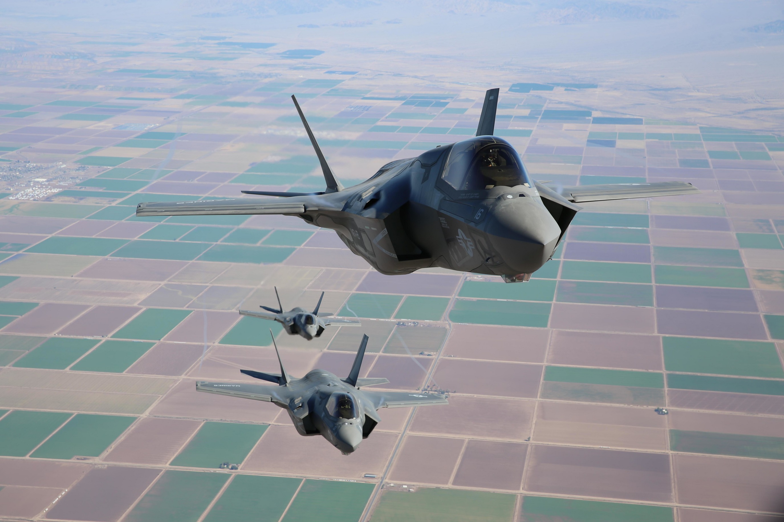 Habituellement la photo du mercredi c’est le matin, cette semaine on change un peu et c’est donc en soirée ! Pour l’occasion il s’agit d’un cliché pris il y a quelques années et montrant trois chasseurs Lockheed-Martin F-35B Lightning II survolant les cultures intensives de l’est californien. Les avions appartiennent à l’escadron VMFA-121 Green Knights de l’US Marines Corps.