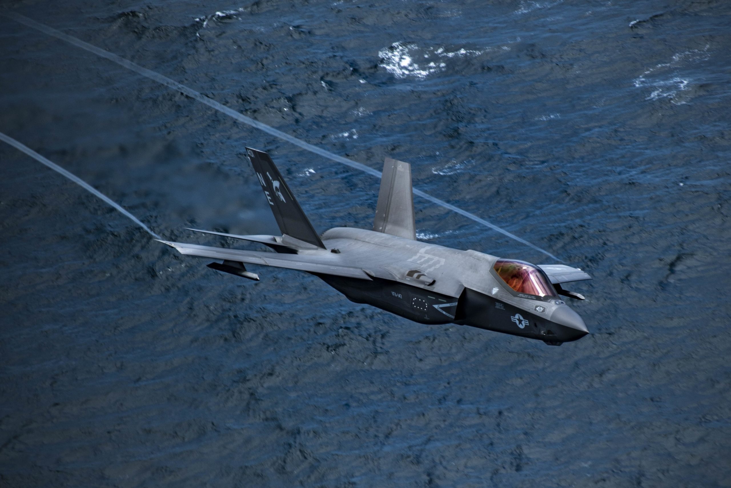 Pour la photo de ce mercredi retour sur le déploiement du porte-avions USS Carl Vinson sur les eaux des océans Pacifique et Indien. Vous y découvrez un des chasseurs furtifs Lockheed-Martin F-35C Lightning II actuellement présents à bord du bâtiment de l’US Navy. L’avion est vu ici au-dessus des flots du golfe du Bengale.