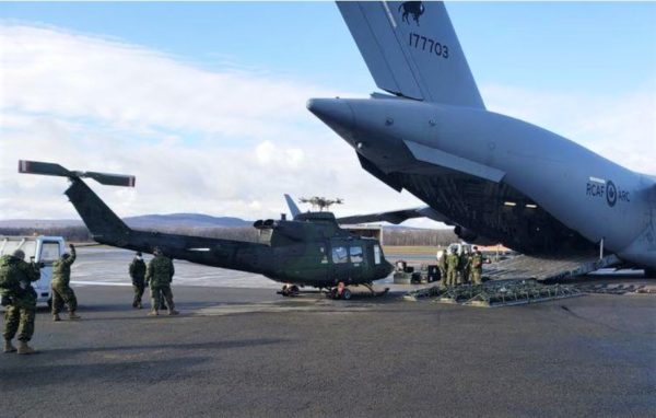 Aux aéronefs de l’ARC déjà présents dans cette province se sont ajoutés des hélicoptères CH-146 Griffon provenant de la province voisine de l’Alberta. Trois appareils du 430ème Escadron tactique d’hélicoptères chargés à bord d’un gros porteur CC-177 Globemaster s’étant posé à l’aéroport de Québec, sont également allés prêter main-forte à l’autre bout du pays. Les hélicoptères Griffon sont mis à contribution pour des vols de reconnaissance, des évacuations et la livraison de nourriture aux communautés isolées.