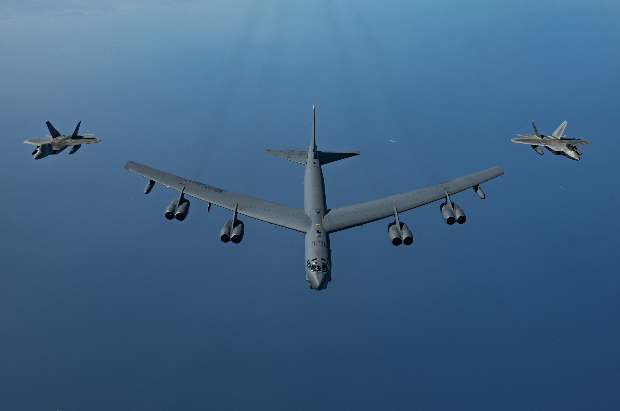 Souvent présentée comme l’aviation militaire la plus efficiente au monde l’US Air Force est aussi souvent un paradoxe à elle toute seule. À quelques mois maintenant de son 75e anniversaire elle aligne encore des avions de générations aussi différentes que le bombardier stratégique Boeing B-52H Stratofortress et le chasseur de supériorité aérienne Lockheed-Martin F-22A Raptor en son sein. Et quand ils se rencontrent en vol ça vaut bien la photo de la semaine.