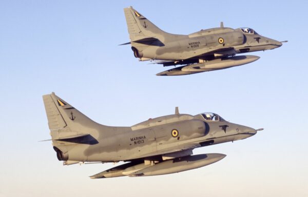 Et dire qu’ils firent durant la guerre froide les belles heures de l’US Navy et de la Royal Australian Navy. Pour la photo direction l’Atlantique sud et plus particulièrement la Marinha do Brasil, dernière force aéronavale à mettre en œuvre les légendaires Douglas A-4 Skyhawk. En danger depuis quelques mois ces avions y sont désignés AF-1.