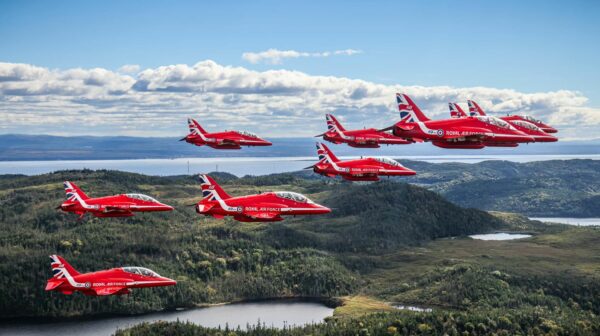 Pour la photo de ce mercredi petit clin d’œil à nos amis canadiens qui ont eu la chance de recevoir l’une des deux meilleures formation de présentation en Europe : les Red Arrows. Leurs neuf BAe Hawk T.1 sont ici visible au-dessus du Labrador, peu après leur départ de la BFC Goose Bay. Les monoréacteurs britanniques se préparaient à attaquer leur voyage transatlantique de retour.