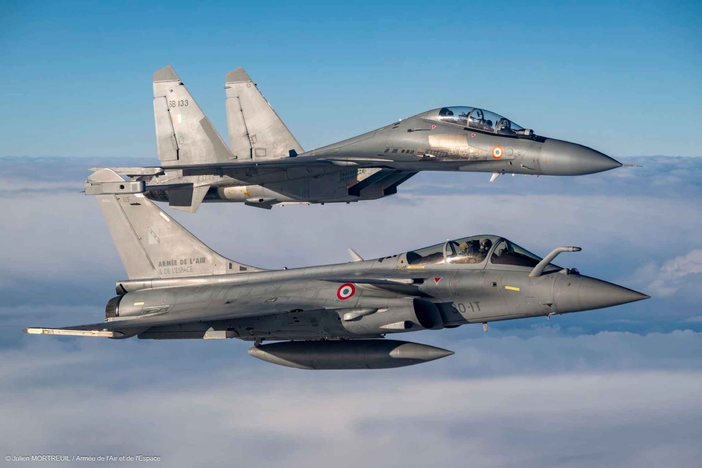 Comme vous pouviez vous en douter la photo de ce samedi 22 novembre 2025 revient sur l’exercice Garuda 25 qui s’est tenu cette semaine dans le ciel français. Vous y découvrez un Dassault Aviation Rafale C et un Sukhoi Su-30MKI Flanker-H en vol de conserve, quelque part au-dessus de l’Hexagone. Le premier appartient à l’Armée de l’Air et de l’Espace et le second à l’Indian Air Force.