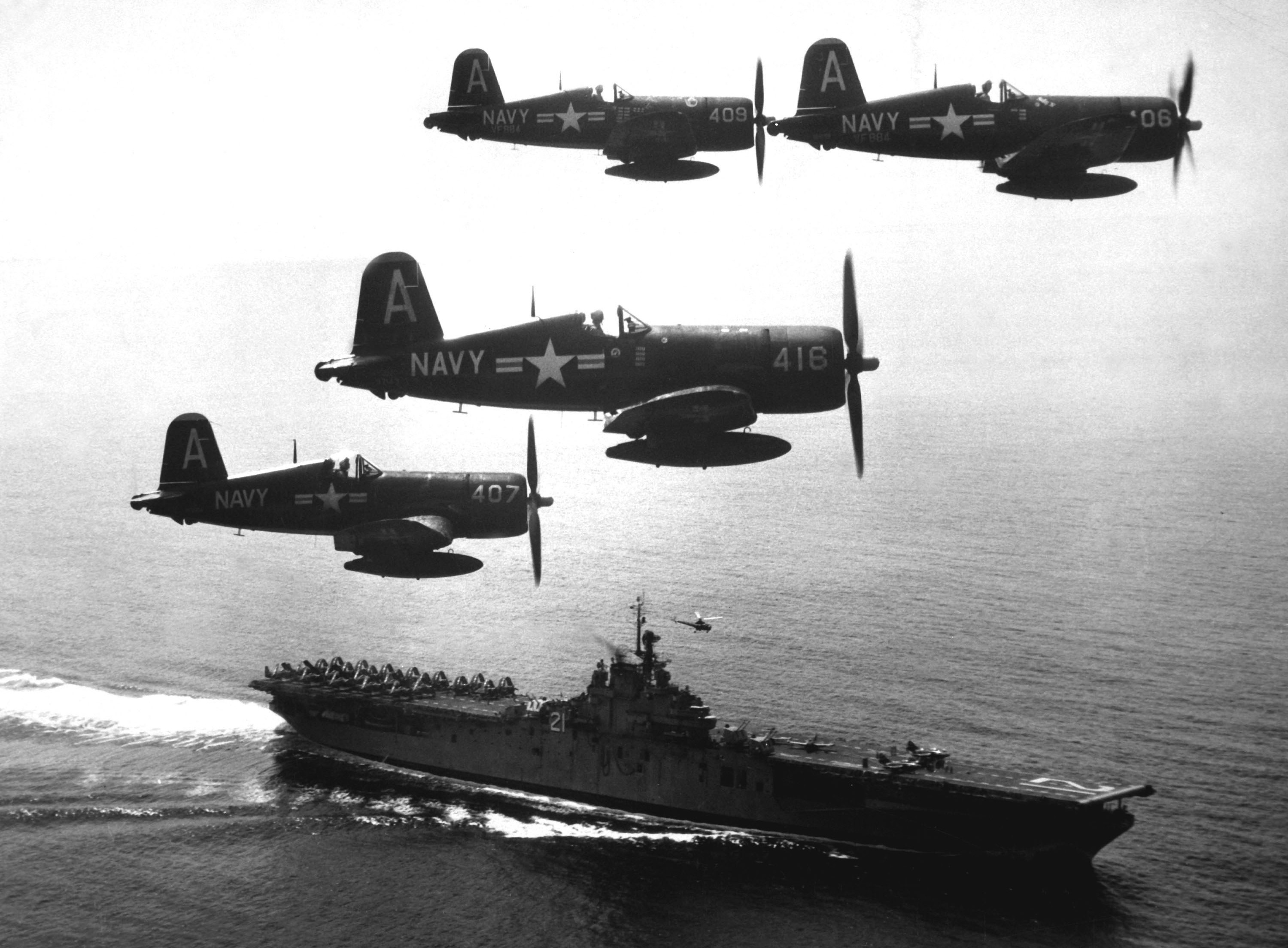 Saisie durant la guerre de Corée alors qu’ils survolent le porte-avions USS Boxer ces quatre Vought F4U-4 Corsair appartiennent à la VF-884 Bitter Birds, une unité de chasse de l’US Naval Reserve Command. Un œil avisé remarquera le Sikorsky R-5 servant de Pedro en vol à côté du bâtiment de guerre.