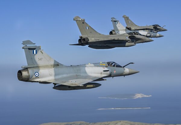 Rassurez vous les cocardes tricolores de ces avions n’ont pas passé au soleil c’est juste qu’elles sont naturellement bicolores. Il ne s’agit donc pas de jets de l’Armée de l’Air et de l’Espace mais de la Polemiki Aeroporia. Nous sommes de ce fait ici en Grèce. Les appareils qui ici volent de conserve sont deux Mirage 2000-5EG et deux Rafale EG.