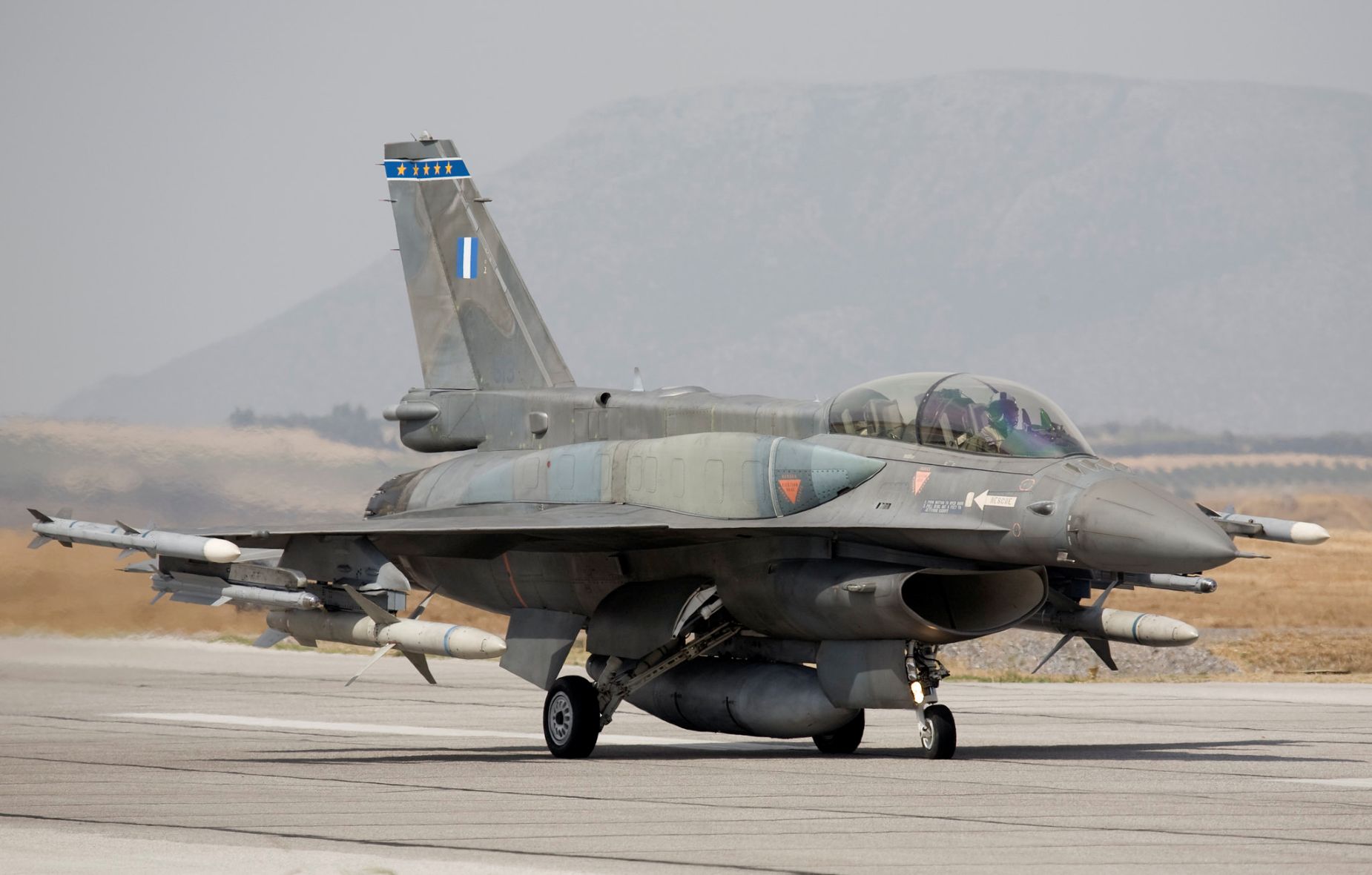 F-16D Block 52+ grec reconnaissable à ses réservoirs conformes en extrados de fuselage.