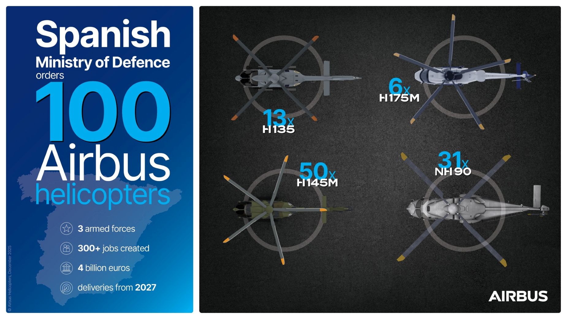 Quatre modèles en tout pour les trois forces espagnoles : Armada Española, Ejército del Aire y del Espacio, et enfin Fuerzas Aeromóviles del Ejército de Tierra. La commande signifiée ce jeudi 18 décembre 2025 par Madrid à Airbus Helicopters c’est clairement le Père Noël avec une semaine d’avance. H135, H145M, H175M, et NH-90 représentent un total de cent hélicoptères qui vont permettre de remplacer d’anciennes machines mais surtout de renforcer l’actuel arsenal aérien. C’est un gros chèque de quatre milliards d’euros que le contribuable espagnol se prépare à signer à l’hélicoptériste européen.