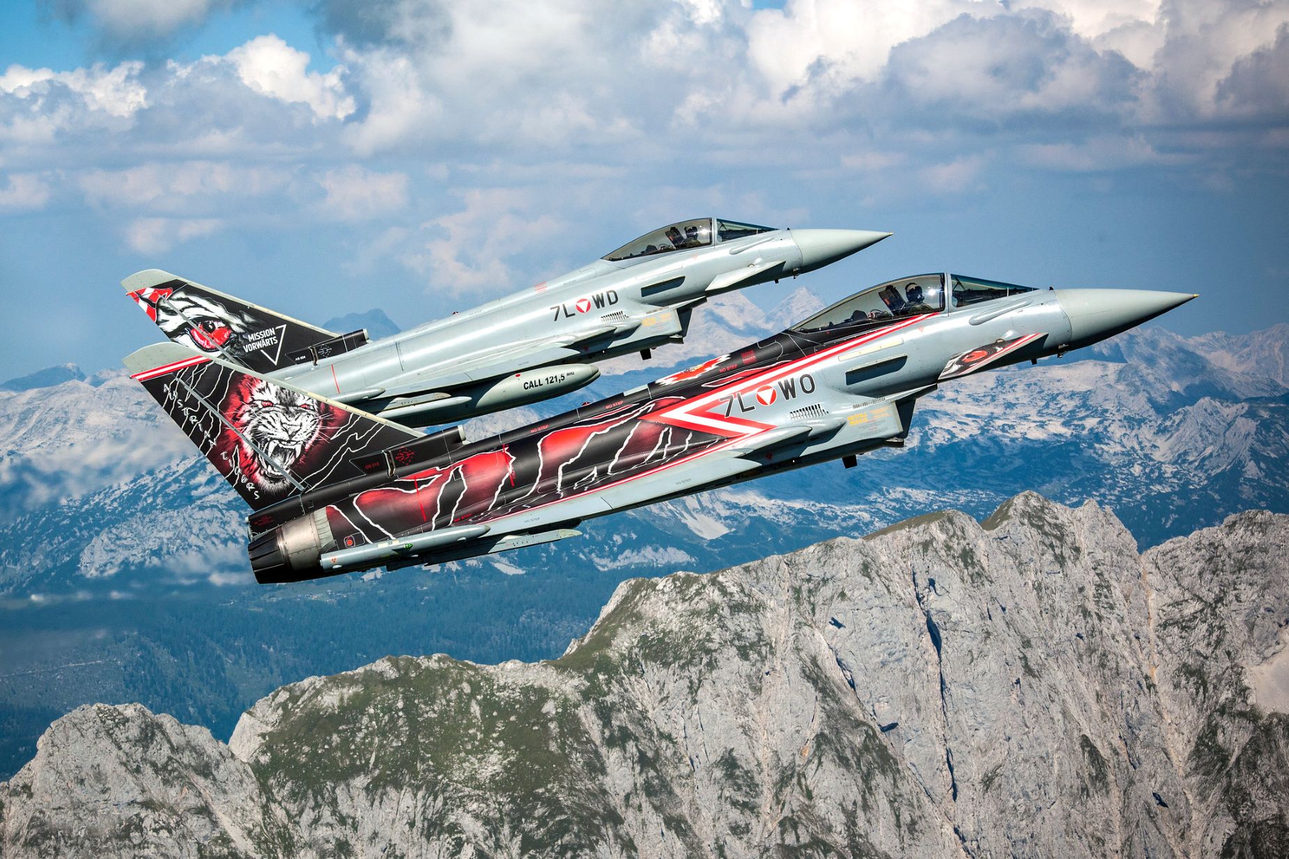 Typhoon autrichien en vol de conserve au-dessus des Alpes.