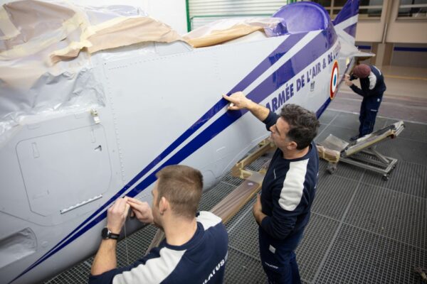 On remarquera que le schéma de décoration imaginée par Régis Rocca est à la fois très novateur tout en respectant une certaine continuité avec un autre avion d’entraînement, lui aussi pensé et construit en Suisse : le Pilatus PC-21 de formation avancée de l’Armée de l’Air et de l’Espace. Les équipes de l’avionneur s’appliquent à sa pose, faite entièrement à la main. L’intervention de machines ne donnerait pas un tel degré de perfection, seul la dextérité humaine la permet.