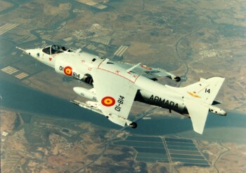 De manière assez surprenante l’US Marines Corps ne fut pas le seul utilisateur du AV-8 Harrier. En 1975 l’Aviacion de la Armada Española chercha à acquérir un lot de douze avions, dix monoplaces et quatre biplaces, afin d’équiper son porte-avions Dedalo. Ce dernier était un ancien navire de l’US Navy de la Seconde Guerre mondiale, l’USS Cabot (CVL 28) racheté par l’Espagne en 1967.