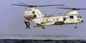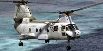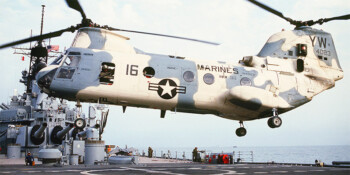 Car c’est là que résida le secret de cette machine, elle fut aussi bien utilisée par l’une et l’autre des deux armes navales américaines. Les Marines firent un large emploi des CH-46D et F, et utilisèrent même plusieurs UH-46D, plus spécifiquement adapté au transport d’assaut et au soutien des opérations amphibies par l’adjonctions d’armes de sabord, et notamment des premières mitrailleuses lourdes M218. Les Sea Knight de l’US Marines Corps furent massivement employés lors de la guerre du Vietnam. C’est là d’ailleurs que l’appareil reçut son surnom de Bullfrog, c’est à dire le « crapaud taureau« . Par la suite ces hélicoptères furent employés dans toutes les opérations de l’US Navy et des Marines, notamment à la Grenade, dans le Golfe, en Somalie, et en ex-Yougoslavie. Véritable bête de somme le petit birotor en tandem était mis véritablement à toutes les sauces.