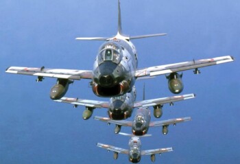Le début des années 1980 et l’apparition de plus en plus fréquente de navires de guerre soviétiques en Méditerranée centrale et occidentale offrit aux G.91Y un nouveau rôle : spotter naval. Depuis les bases continentales et insulaires italiennes ils réalisaient des approches à basse altitude des dits navires et les photographiaient sous toutes les coutures. Si aucun panier à roquettes n’était alors emporté les canons mitrailleurs étaient eux bien alimentés en obus de 30 millimètres. On ne sait jamais.