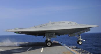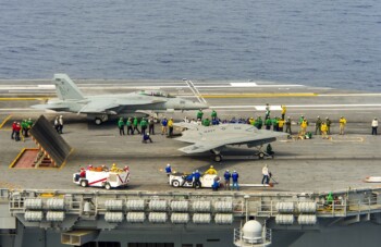 Quelques semaines plus tard le Président des États-Unis Barack Obama dépêcha à bord de l’USS George Bush son secrétaire à la marine Ray Mabus. Et devant l’officiel, accompagné de plusieurs amiraux, un Northrop Grumman X-47B apponta. Il avait rejoint le bord, et donc l’Atlantique nord depuis sa base de NAS Patuxent River. Dans la foulée Mabus annonça que des crédits seraient débloqués afin de donner une succession opérationnelle à ce drone.