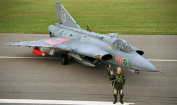 Le J35A Draken est entré en service en 1959 et a été suivi de cinq versions différentes pour l’Armée de l’Air suédoise. Au début l’avion n’était employé que pour des missions de chasse, puis la version J35D introduisit une capacité air-sol. Le J35F tous temps est la dernière version, avec son radar technologiquement avancé à l’époque, son système infrarouge de recherche et de poursuite, et ses missiles guidés IRS. En tout, 612 Drakens ont été construits entre 1955 et 1972. De ces derniers, 51 ont été exportés vers le Danemark, la Finlande a assemblé 12 sous licence et a acheté plus tard un certain nombre d’avion suédois déclassés, et l’Autriche a commandé 24 Drakens modifiés. Le J37 Viggen fut concu pour le remplacer dans son rôle de chasseur. Le dernier exemplaire fut construit en 1972, aujourd’hui il est prévu de remplacer les derniers J35 Draken encore en activité par les nouveaux JAS 39 Gripen.