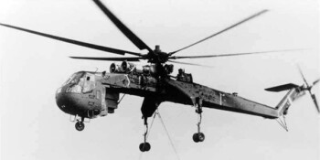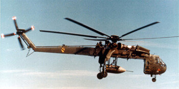 Ce même principe fut immédiatement mis en œuvre par les équipes de l’hélicoptériste Sikorky qui décidèrent de baser leur nouvel appareil sur des éléments provenant du SH-3 de l’US Navy. En effet, la nouvelle machine conservait le cockpit, certains éléments hydrauliques, ainsi que le train d’atterrissage avant du Sea King. Par ailleurs, l’appareil, désigné S-64 dans la nomenclature constructeur, était authentiquement une machine inédite. Il disposait d’une poutre de queue très longue sur laquelle était monté un arbre de transmission qui reliait le bloc propulseur, constitué de deux turbomoteurs Pratt & Whitney, au rotor anti-couple quadripâle. Le rotor principal disposait quant à lui de six pâles. Le cockpit avait la particularité d’être triplace. Un pilote et son copilote prenaient place de manière classique, tandis que le mécanicien leur tournait le dos, et disposait d’une verrière lui permettant de surveiller les charges transportées soit sous élingue, soit directement accrochés sous la poutre de queue. Afin que cette seconde configuration soit possible, les ingénieurs de Sikorsky avaient eu l’idée d’installer des jambes de train de grande taille qui enserraient totalement les charges transportés. Afin de rationaliser les modes de transport sur le S-64, ces mêmes ingénieurs inventèrent un système de containers appelés Universal Military Containers (UMC) et permettant de charger toutes sortes de marchandises mais également des soldats équipés, grâces à des lignes de sièges amovibles.
