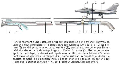 Au moment du catapultage, l’avion, moteur ou réacteur à plein régime, est entraîné par le sabot qui lui imprime une accélération pouvant atteindre 5g et une vitesse comprise entre 90 et 120 noeuds par rapport au pont. En bout de course, les deux pistons sont arrêtés sur deux ou trois mètres par un puissant frein hydraulique, l’élingue se décroche d’elle-même de l’avion et celui-ci décolle, ayant atteint sa vitesse minimale de sustentation aérodynamique . La vapeur détendue n’est pas récupérée et est évacuée sous la flottaison, chaque catapultage entraînant ainsi une consommation de quelque 400 kilogrammes d’eau douce.
