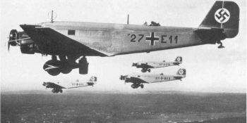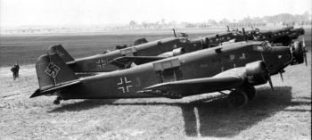 A l’instar de nombreux autres matériels aériens allemands conçus dans les années 30, le trimoteur de Junkers fut réellement testé de manière opérationnelle lors des combats que la légion Condor mena en Espagne en 1936 aux côtés des troupes franquistes. A cette occasion, si quelques Ju 52 remplirent des missions de bombardement, c’est principalement comme avion de transport de parachutistes qu’il s’illustra. En effet, avec une capacité d’emport pour 18 hommes de troupe aéroportés, le Ju 52 était à ce moment là le principal avion de largage de paras au monde. C’est justement en Espagne qu’il reçut le sobriquet de « Tante Ju« , qui allait lui coller à la peau. Il semblerait que ce soit d’ailleurs des combattants français, mais engagés dans l’autre camp au sein des Brigades Internationales, qui l’ai ainsi affublé. Quoiqu’il en soit la Guerre d’Espagne avait démontré toutes les qualités de cet avion si particulier. Et l’Europe n’était pas loin de le découvrir elle aussi.