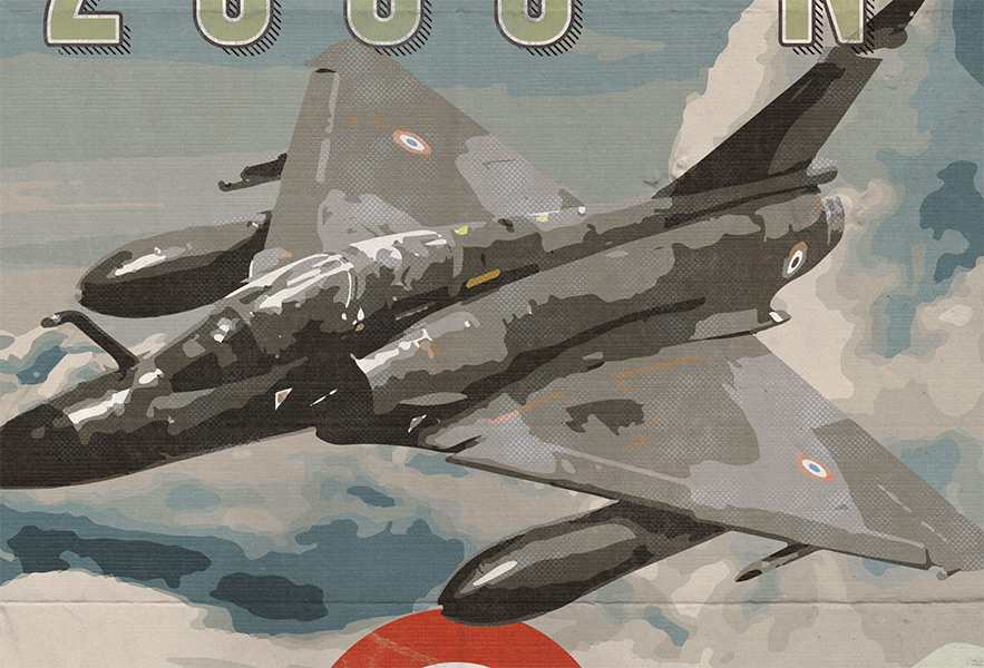 Premier poster d’une série intitulé « French Air Force » avec une charte graphique inspirée de la bande dessinée ancienne, avec sa tonalité rétro ou vintage. Sur cette première affiche est présenté le puissant Dassault Mirage 2000-N des Forces Aériennes Stratégiques.