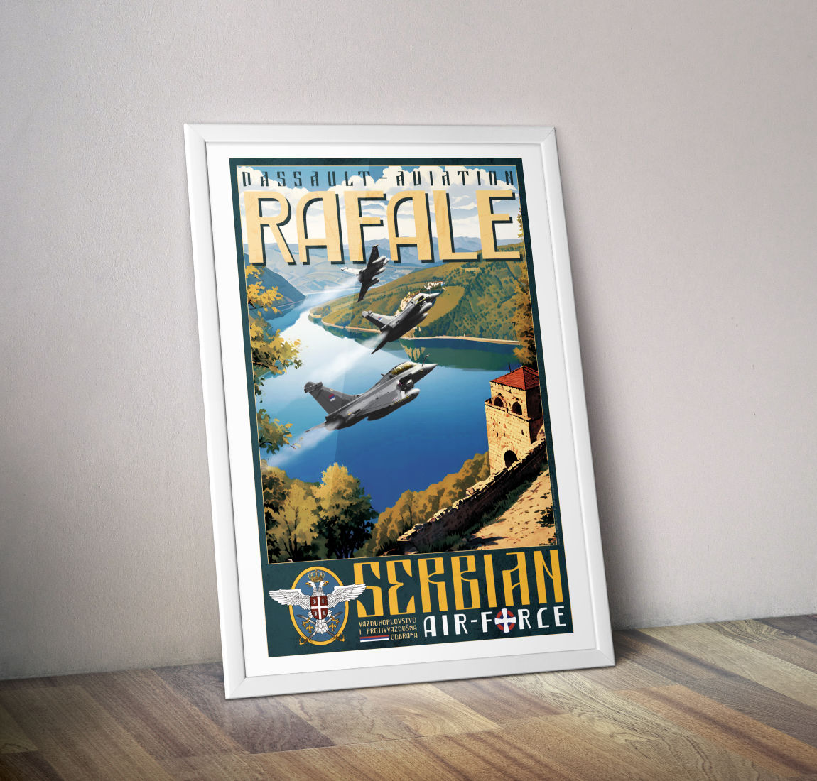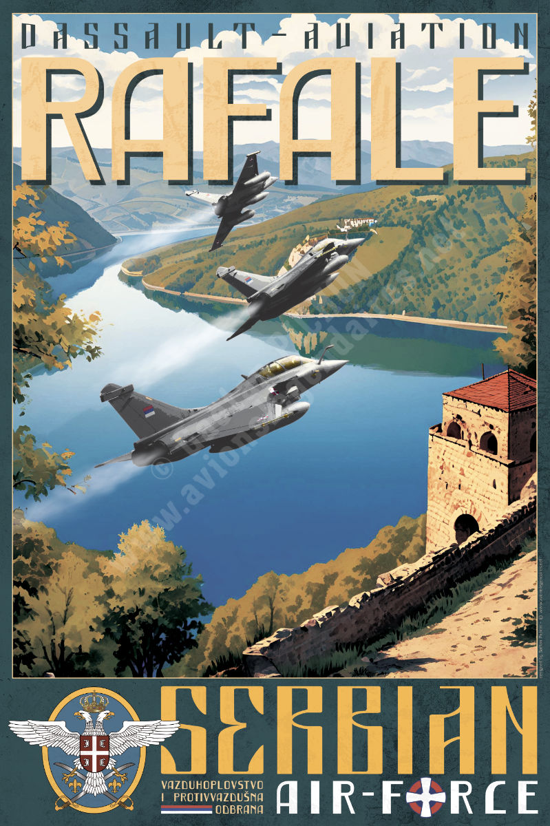 Une nouvelle affiche pour se féliciter de l’arrivée du Rafale au sein de l’armée de l’air serbe : Vazduhoplovstvo i protivvazdušna odbrana. Belgrade fait partie des nombreux pays ayant choisi le chasseur de Dassault Aviation. L’acquisition par la Serbie intervient à raison de 12 avions de combat Rafale. Les références visuelles font ici aussi un lien avec les affiches touristiques du 20ème siècle dans un poster aux effets vintage et rétro. Le groupe de Rafales survole les paysages sauvages serbes : montagnes, forêts et lacs.