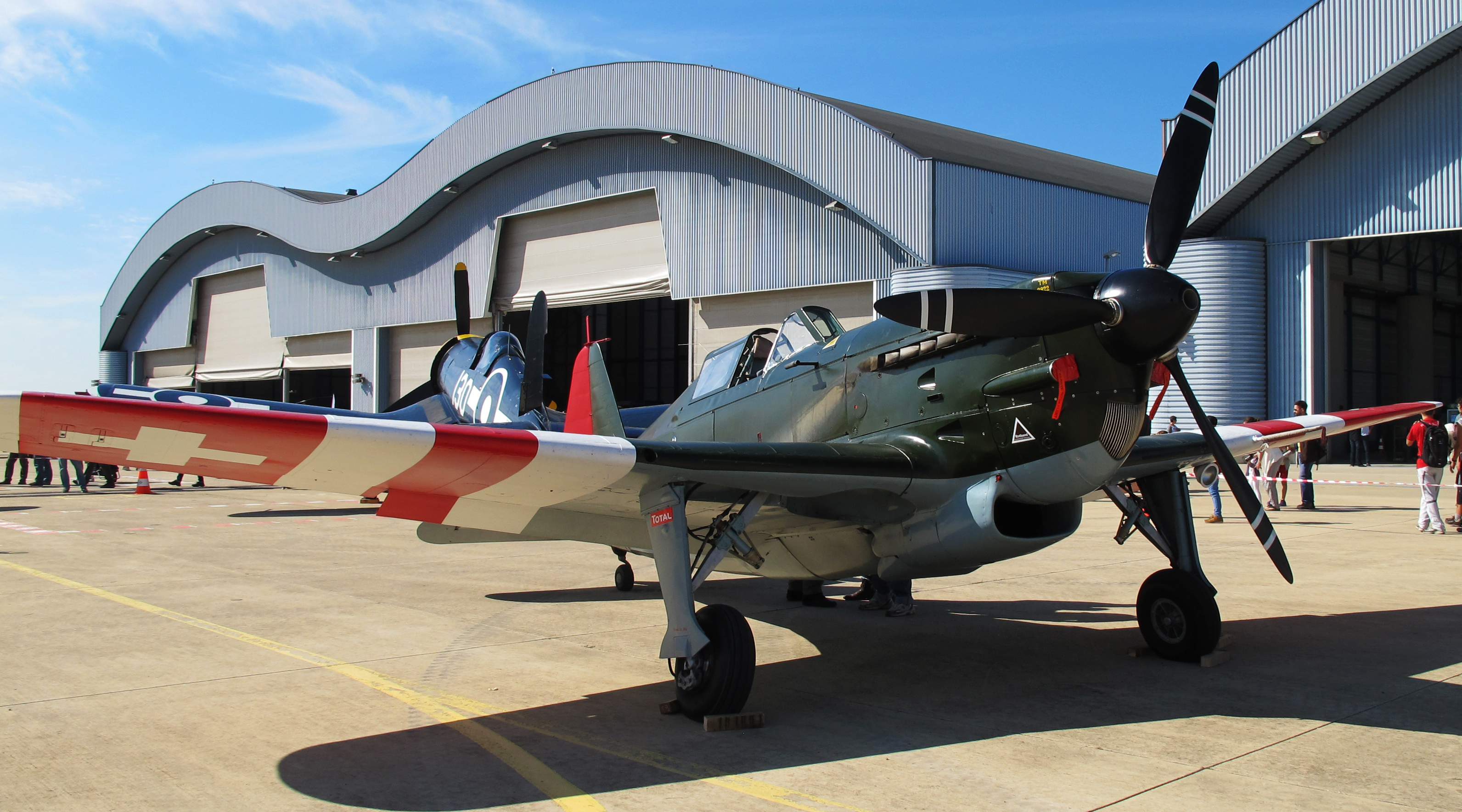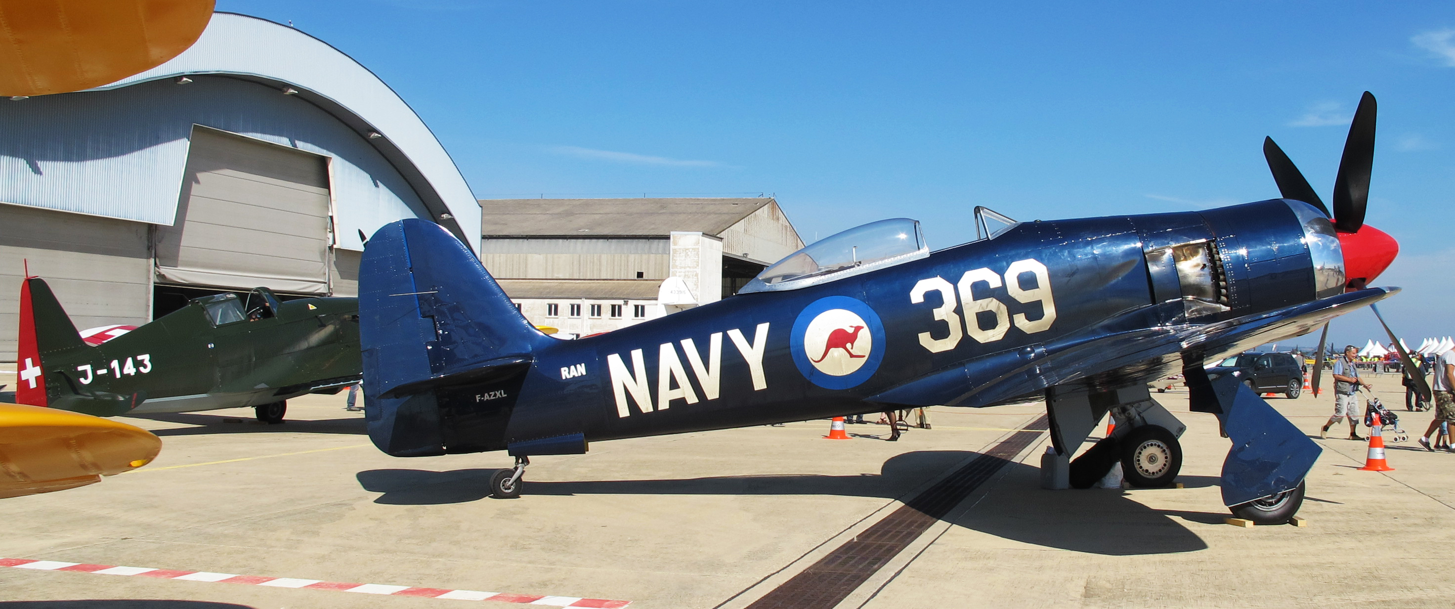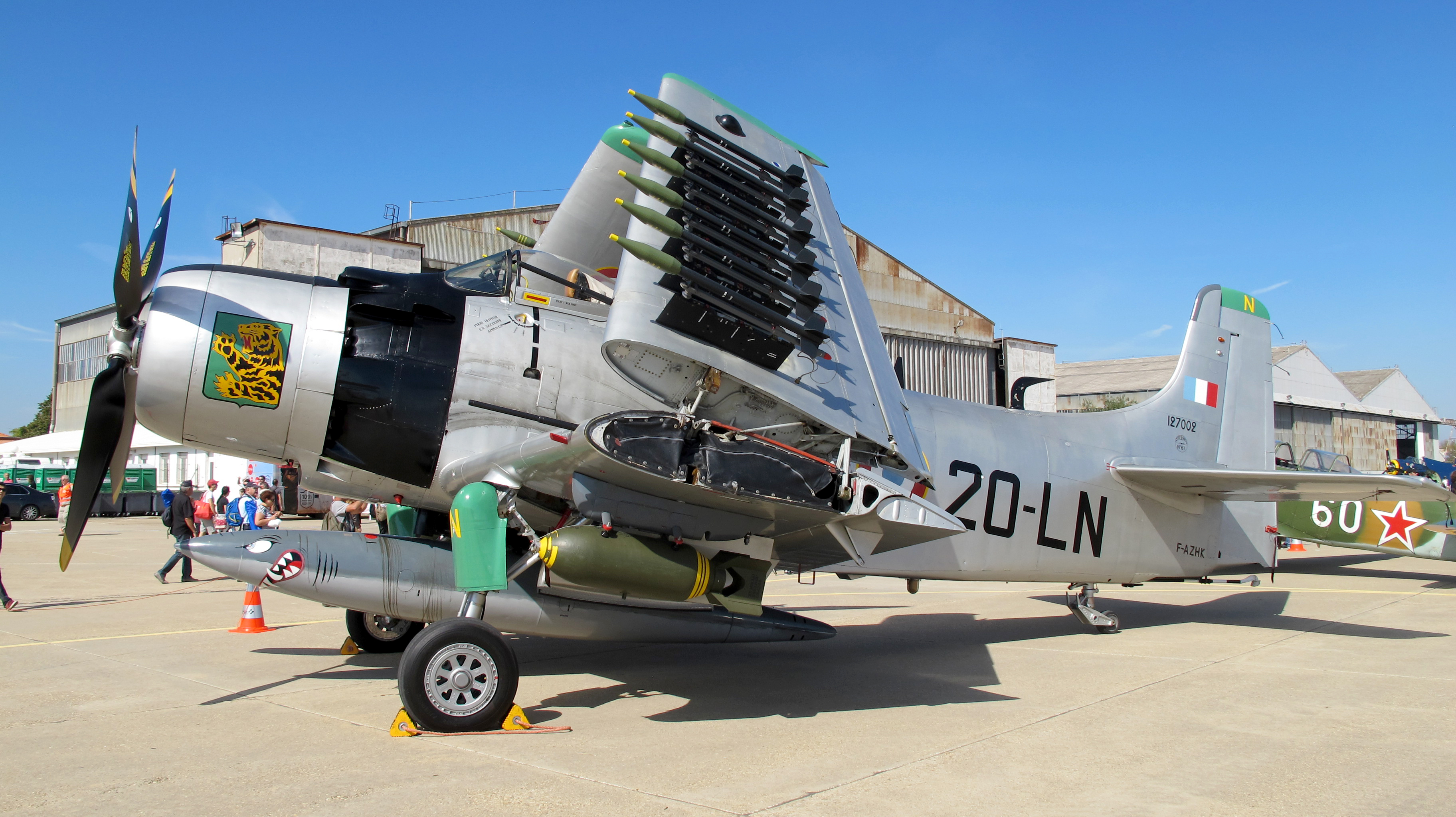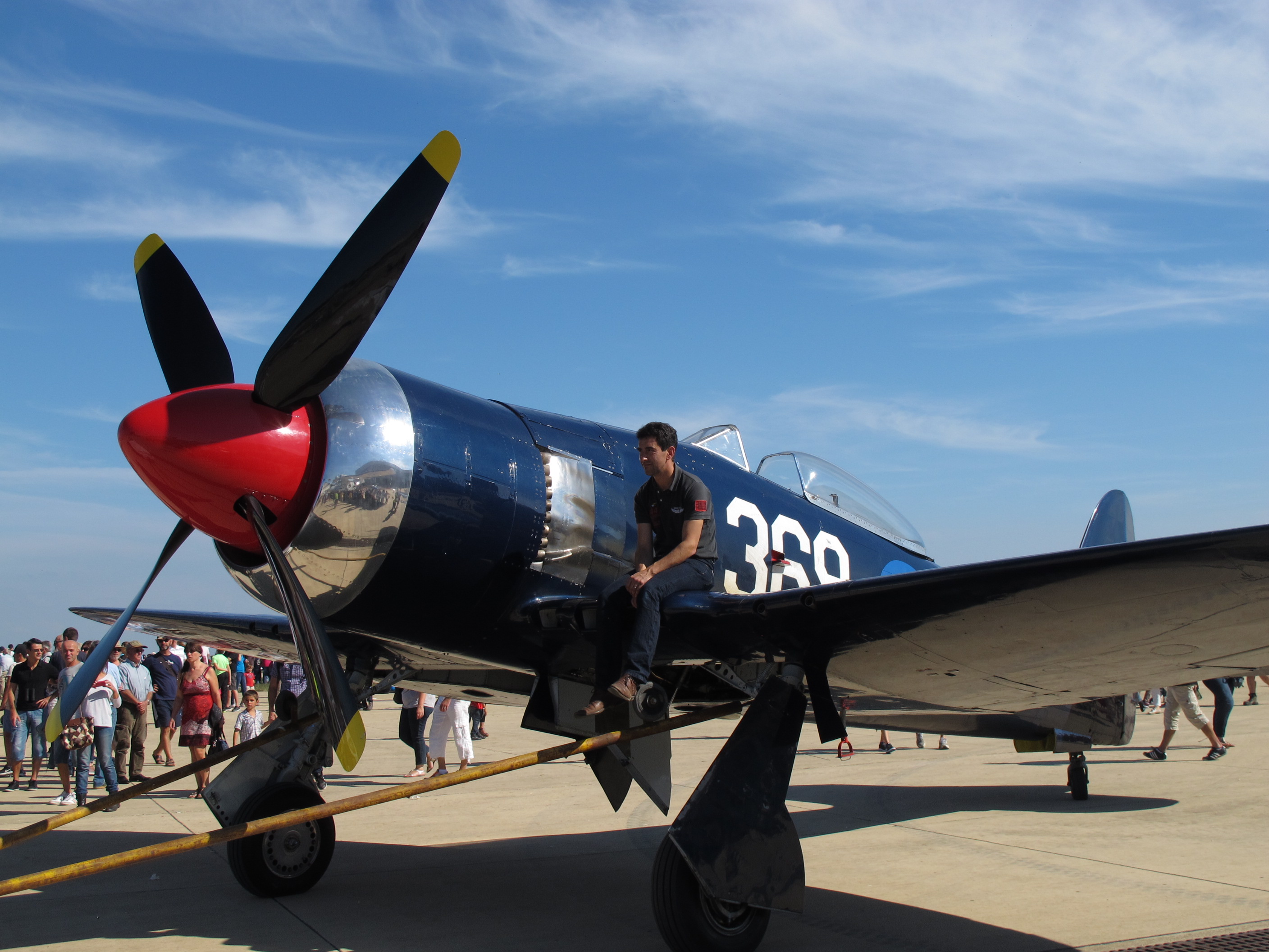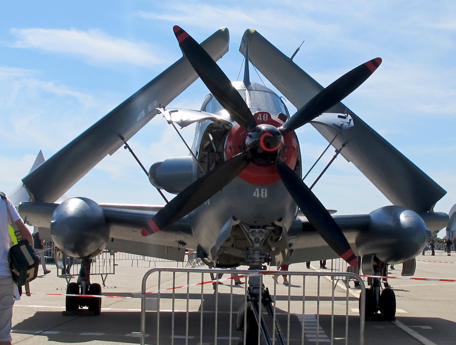 L’après-guerre était très présent avec des T-6 (dont un faux Zéro), le Zlin Trener, le Yak-11 aux accents de Guerre Froide, le très beau Hawker Sea Fury, quintessence de l’hélice, aux couleurs australiennes. Les machines de combat américaines étaient bien représentées avec le Skyraider, puissamment armé et autre représentant de l’aéronavale, Douglas A-4 Skyhawk du (mystérieux ?) groupe Draken et l’OV-10A Bronco. Du côté français, l’émouvant petit bébé Jodel, amorce d’une aviation amateure, et, avec des turbines, un Morane-Saulnier MS.733, deux MD.312 Flamand, deux Fouga Magister (Patrouille Tranchant) à la démonstration pleine d’habileté… et de décibels. Toujours à turbine (RR Dart) l’inévitable Bréguet 1050 Alizé, formidablement à sa place sur cette base.