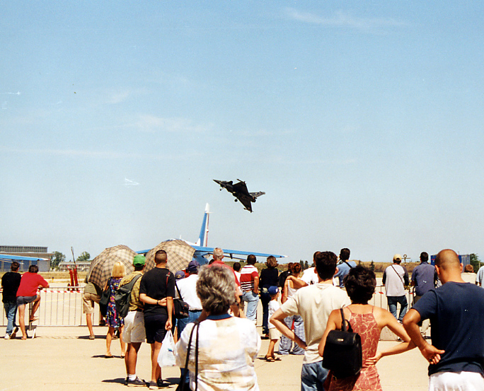 Déjà un T-6, un Corsair avec sa livrée française, un Skyraider, un Fouga (je ne sais pas s’il était « marine »), un beau Skyraider, un Bréguet Alizé.  Il y avait aussi, pour faire « warbird », un T6 et un Yak 52 décoré à la soviétique. Donc beaucoup moins d’avions anciens qu’aujourd’hui, mais deux Anglais prestigieux : un Harrier et un Nimrod qui a fait de majestueux passages. Un P-51D, un Mistral (Vampire), deux Mirage 2000 complétaient le panel. Mais il y avait la Patrouille de France et le Rafale qui faisait déjà des démonstrations à couper le souffle. C’était un très beau meeting mais moins fourni et moins axé sur les avions anciens que celui de 2015. Il faut dire que l’offre dans ce domaine s’est considérablement étoffée, on le voit bien dans le reportage sur le meeting de Haguenau. Il y avait aussi beaucoup, mais beaucoup moins de public qu’aujourd’hui.