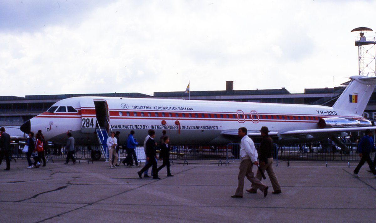 Dans la catégorie des grands avions d’affaires à la limite des petits « commuters » Grumman occupe une belle place avec les Gulfstream II et III. Sur la photo que j’ai prise, notre savant ami Arnaud pense qu’il y a « un Gulfstream III et un Gulfstream IV, qui pourrait même être le prototype transformé dans la cadre du programme S-102B Korpen, la version de reconnaissance et de guerre électronique acquise en 1986 par la Suède en remplacement de ses deux Caravelle ». J’ai pris un autre oiseau rare en photo, intrigué par les couleurs roumaines, un Rombac 1-11, Bac one-eleven construit en Roumanie, mais que Ceaucescu ne parviendra pas à vendre.