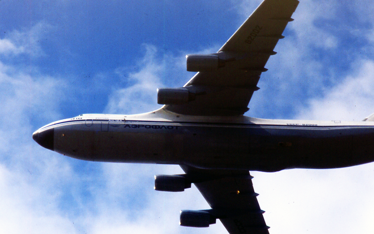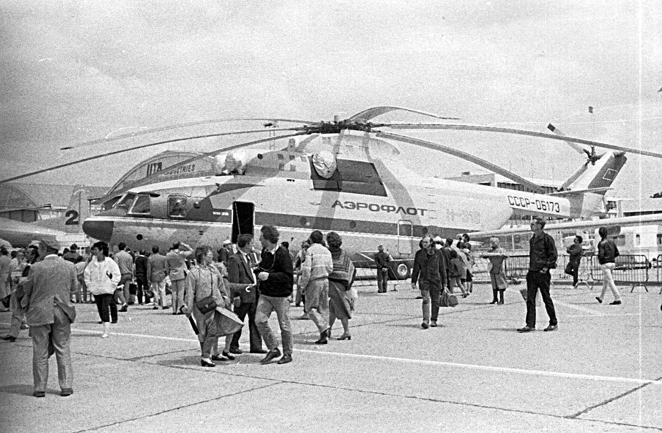 Certes, il y a quelques civils cette année, comme le Yak-42, le Tupolev Tu-154, sorte de Tu-134 allongé et triréacteur, les hélicoptères comme le gros Mil Mi-26, le plus gros hélicoptère du monde construit en série, pouvant transporter 20 tonnes, et le petit Kamov Ka-32. Mais les militaires sont absents, comme d’habitude. L’ours soviétique cultive sa paranoïa. Il dévoile le plus gros avion du monde, un peu plus gros que le C-5A (obligé !), l’Antonov-124 de 379 tonnes, qui multiplie les passages, montrant son train d’atterrissage à roues multiples.