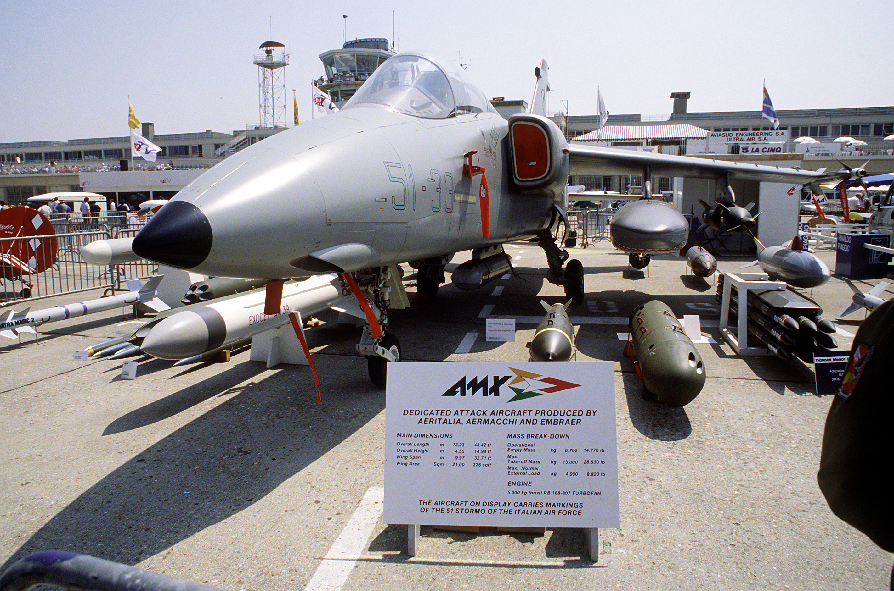 Autres vedettes, les nouveautés dans le domaine militaire : l’AMX se distingue par l’alliance exotique des italiens Alenia et Aermacchi avec le brésilien Embraer. Avion d’attaque proposé aux pays émergents surtout. Il manque le Northrop F-20 dont le prototype s’est écrasé peu avant le salon, et le F-18. On peut voir en revanche les avions européens, Tornado, Mirage F1, Alphajet, Jaguar, Bréguet Atlantic2, Super Etendard proposé en version terrestre et le Tucano brésilien, qui amorce une percée en Europe dans le domaine des avions d’entrainement de niveau intermédiaire. Dans cette catégorie, le Macchi MB 339 montre ses belles lignes… et ses munitions.