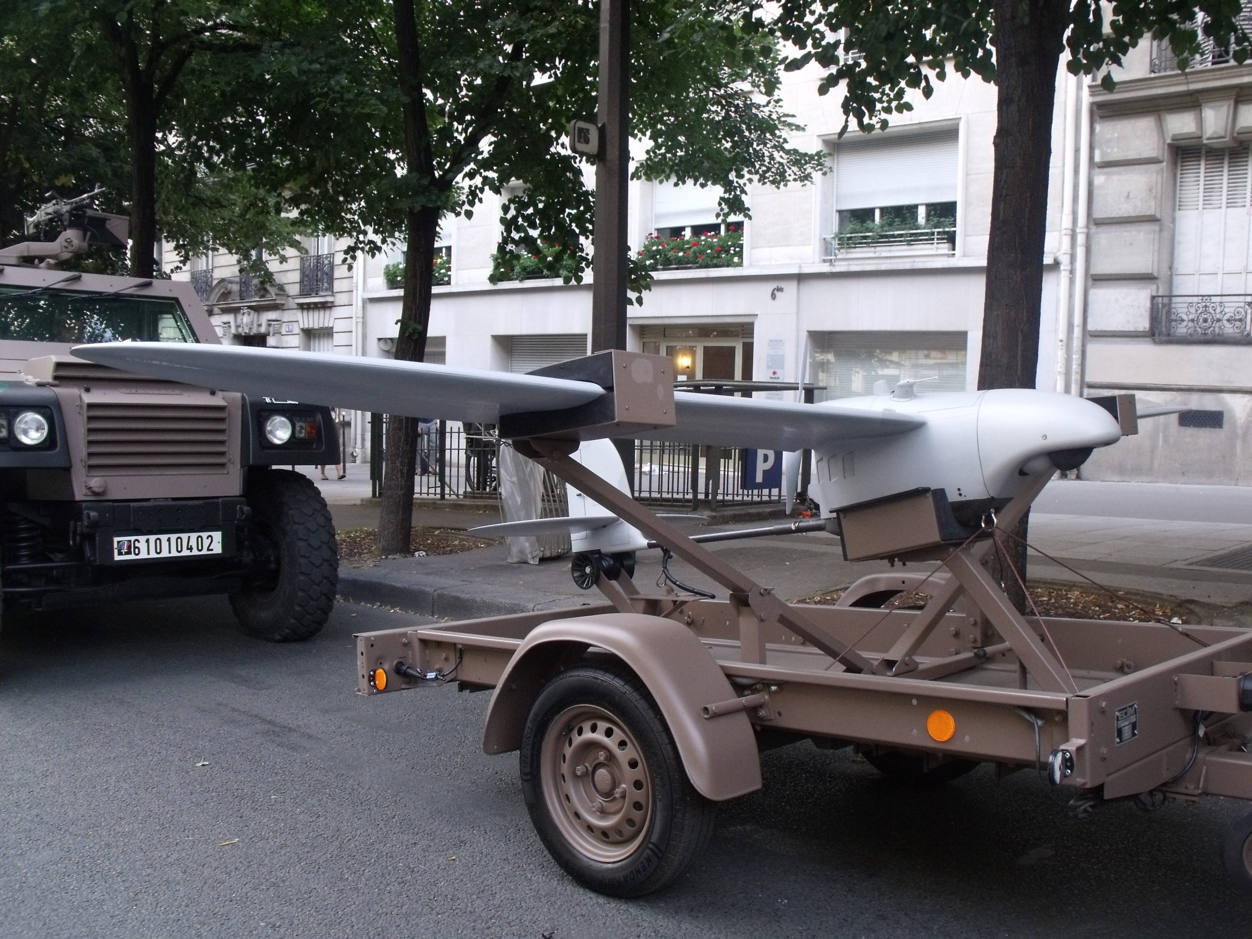 Bien sûr le 14 juillet il n’y a pas que des hélicoptères qui viennent se poser sur les champs il peut y avoir d’autres surprises pour les passionnés d’aviation et cette année c’est le 61e Régiment d’Artillerie qui est venu avec son tout nouveau SMDR, Système de Mini Drone de Renseignement qui remplace le DRAC. Ce SMDR est un produit français développé par Thales.